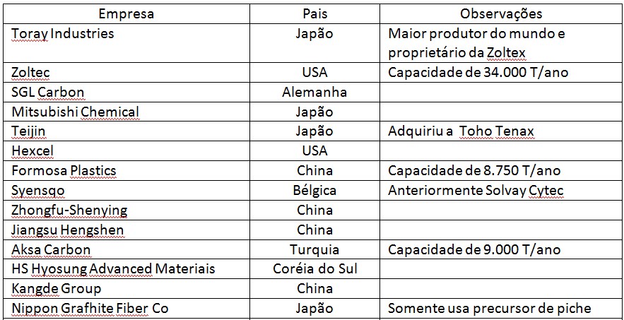 Aproximadamente 90% da produção de fibra de carbono do mundo utiliza as fibras de PAN como precursora, sendo o restante produzido com outras matérias primas como o piche e o rayon. A produção atual de fibra de carbono é de 140.000 toneladas por ano o que representa uma produção de fibra precursora de PAN na ordem de 280.000 toneladas por ano, considerando que o rendimento de carbono desta fibra é de aproximadamente 50%. A capacidade de produção mundial é da ordem de 151 mil toneladas por ano.