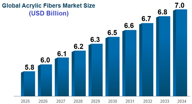 No ano de 2024 o consumo mundial de fibras acrílicas foi estimado em aproximadamente 1,6 milhões de toneladas. Este volume já foi muito maior e tem perdido espaço para outras fibras sintéticas, principalmente para o poliéster. Quanto ao valor de mercado é estimado em 2025 em US$5,8 bilhões, mas deve atingir US$7 bilhões em 2034 com um crescimento de 2,1% ao