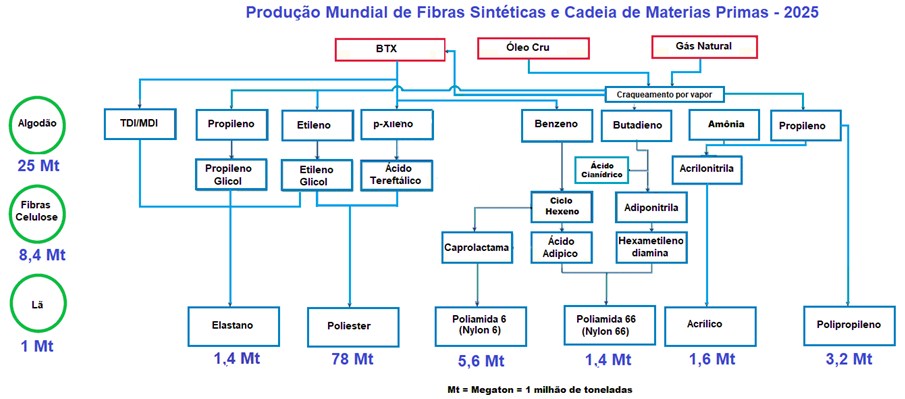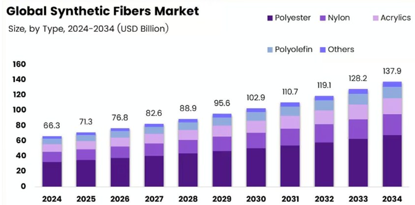 O mercado de fibras sintética é dominado pelo Poliéster, seguido do nylon (poliamida), polipropileno, ficando em quarto lugar as fibras acrílicas com um produção de 1,6 milhões de toneladas por ano em 2025.